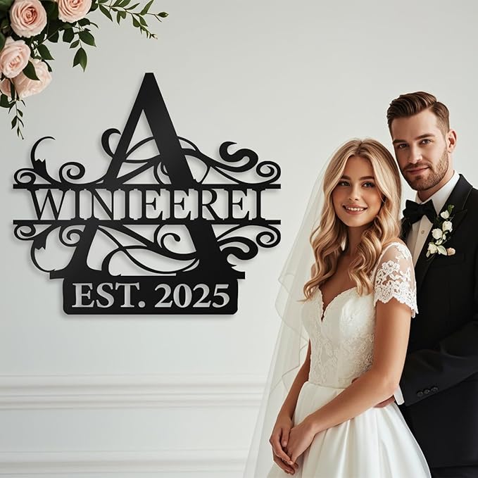 Verleihen Sie Räumen Identität mit unserem personalisierten Monogramm-Schild, das Namen, Datum und Initialen in einem modernen Split-Letter-Design vereint.